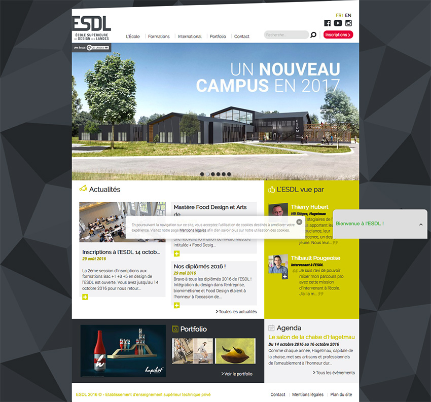 En partenariat avec l’agence toulousaine HÔTEL RÉPUBLIQUE, Connexion Digitale réalise une première mission pour l’École Supérieure de Design des Landes. Cette opération s’intègre dans un projet d’envergure pour l’ESDL qui souhaite s’implanter de façon durable dans le paysage des grandes écoles dédiées au “DESIGN“.